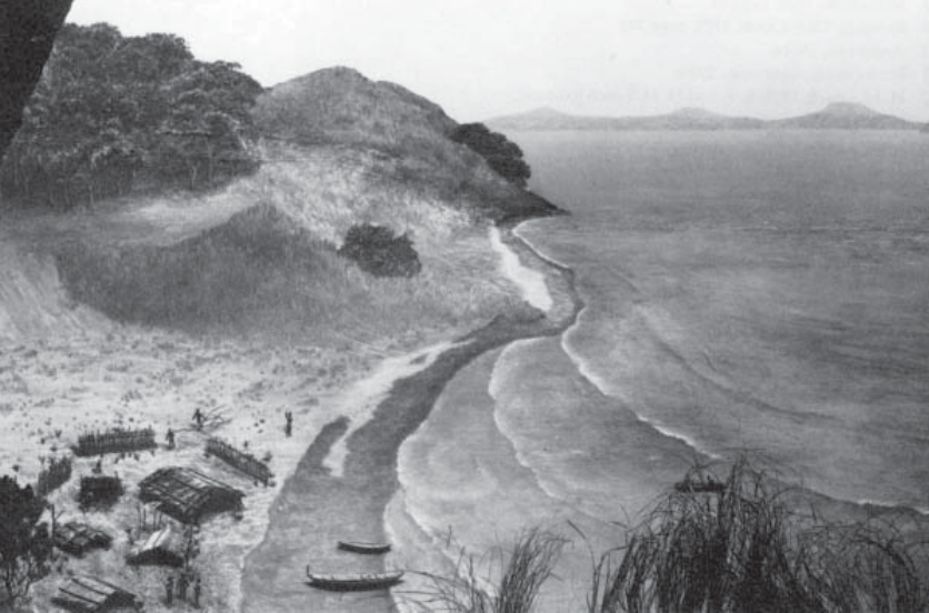 Artist's impression of the Sunde site prior to Rangitoto Eruption. Auckland Institute and Museum. Reproduced in Davidson 1984-43.